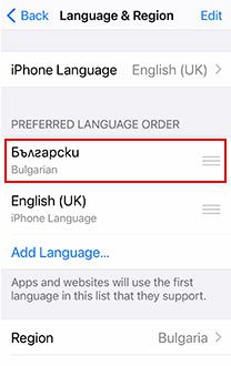 Отидете в настройките на вашия телефон на Settings - Language & Region и в раздела Preferred language order преместете Български на първо място, както е на картинката по-долу. Ако нямате Български език в този списък, го добавете от бутона Add Language. Така всички приложения, които поддържат това, ще са вече на Български език.
