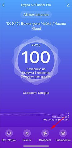 Пречиствателят може да пуснете и спрете от бутона долу в ляво Вкл./Изкл.